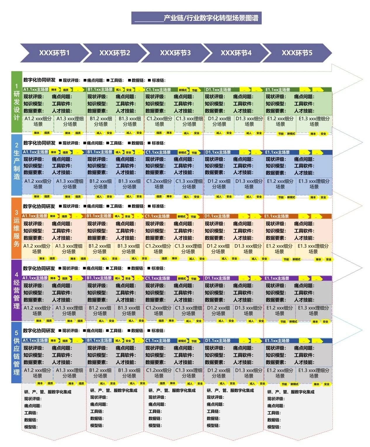 聚焦产业链上下游企业研发设计、生产制造、运维服务、经营管理、供应链管理等场景,以场景为切入点梳理数字化转型痛点需求,绘制重点行业、重点产业链数字化转型场景图谱(简称“一图谱”),明确企业数字化转型路径,促进产业链上下游企业协同开展转型升级。分场景梳理数据要素、知识模型、工具软件、人才技能等数字化转型要素清单(简称“四清单”,合称“一图四清单”),助力政产学研各界联合攻坚场景数字化转型关键难点。