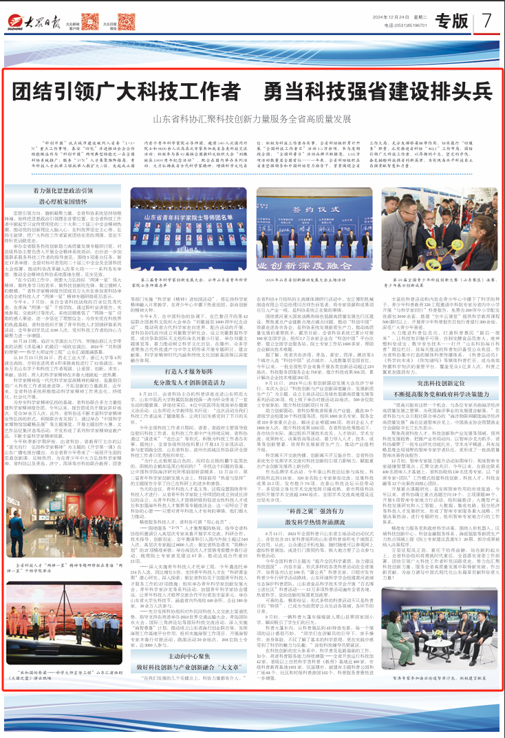 今年全国科技工作者日期间,省委、省政府主要领导致信慰问科技工作者,在科技工作者中产生持续反响。省科协通过“请进来”“走出去”等形式,积极为科技工作者办实事。据统计,全省各级科协组织累计开展2.5万余项活动,参与度领跑全国,山东省科协、滨州市滨城区科协获评全国科技工作者日优秀组织单位。