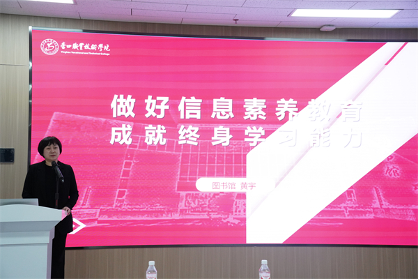 图书馆馆长黄宇回顾了五年来我校参加信息素养大赛的历程,她从线上课堂、线下教学及入馆实践等方面分享了图书馆全体工作人员如何做好知识及信息服务,使图书馆工作有特色、比赛有成果。并分享了信息素养大赛给参赛学生们带来的成长,给图书馆全体工作人员带来的惊喜。