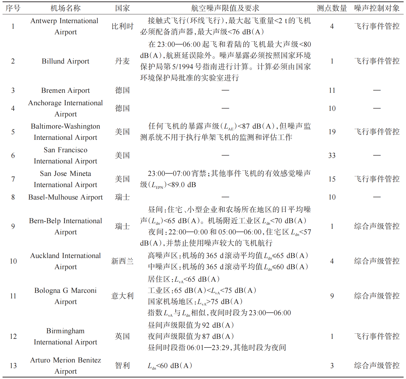表1 国外部分机场航空噪声自动监测与噪声限值