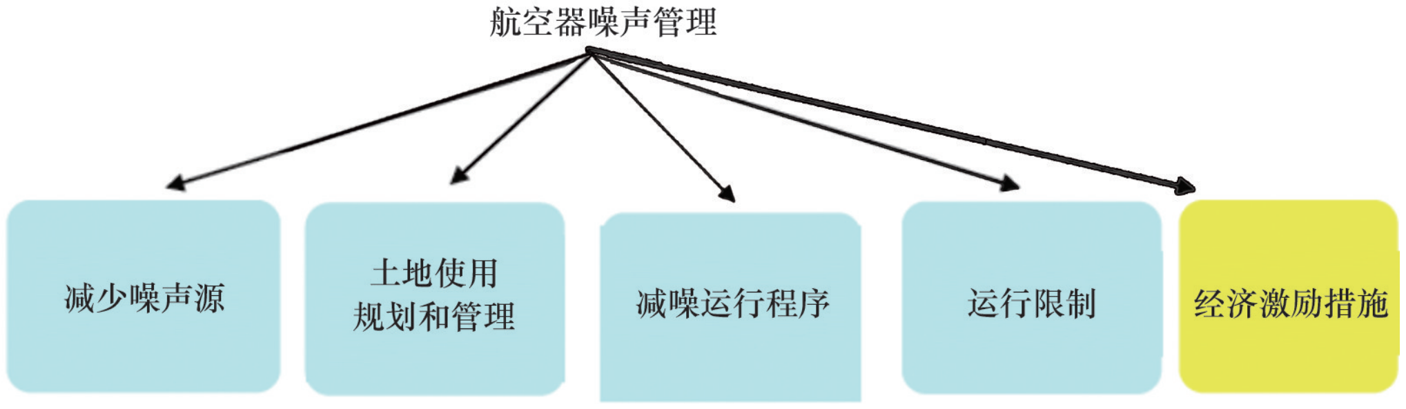 国际民航组织(ICAO)2001年发布了《航空器噪声管理平衡做法指导》。航空器噪声主要从减少噪声源、土地使用规划和管理、减噪运行程序和运行限制4个方面控制噪声污染。平衡做法为缔约国提供了灵活的方法,各国机场从以上4方面,依据机场的实际情况,制定相应噪声削减措施(图1)。(1)减少噪声源。在机场运行中逐步淘汰高噪声航空器,开发新型低噪声航空器。(2)土地使用规划和管理。通过合理规划机场周围土地,使住宅和学校等和航空器噪声影响不相容的土地使用远离机场噪声影响区域,鼓励将工业和商业等和航空器噪声影响相容的土地使用安排在机场周围。(3)减噪运行程序。采用优先跑道、优先航路等措施,避免或减少航空器在噪声敏感区上空飞行;采用优化地面噪声声级分布的减噪起飞程序、减少油耗和地面噪声的连续下降进近程序。(4)运行限制。限制或禁止高噪声航空器在机场起降,限制或禁止使用噪声影响大的跑道,采取时段限制、架次限制等管理措施。同时,平衡做法中也可综合应用经济手段控制航空器噪声。