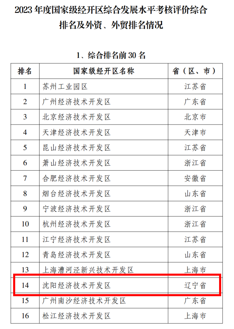 开年传喜讯,经开亮成绩。近日,商务部公布2024年国家级经济技术开发区综合发展水平考核评价结果,在229家国家级经济技术开发区中,沈阳经济技术开发区(以下简称沈阳经开区)综合排名第14位,较上一年度前进18个位次,位居东北地区第一位,成功挺进国家经开区排名第一方阵。
