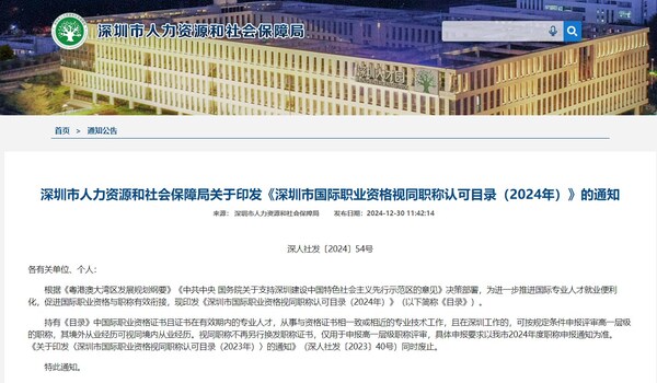 深圳市人社局发布《深圳市国际职业资格视同职称认可目录(2024年)》