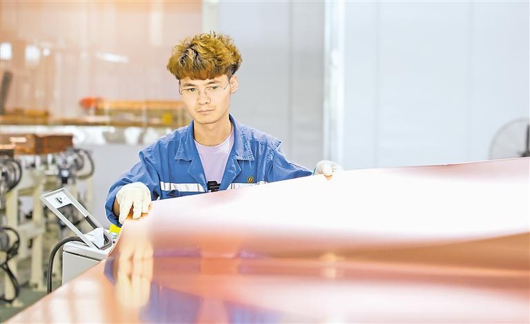宁夏锦航新材料科技有限公司员工将材料送进机床。记者 李宏亮 摄