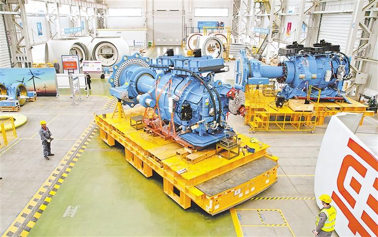 中卫市海原县海兴开发区,宁夏中车新能源有限公司风电整机装备制造项目现场,工人操作天车将主传动链置入机舱罩。记者 王晓龙 白茹 摄