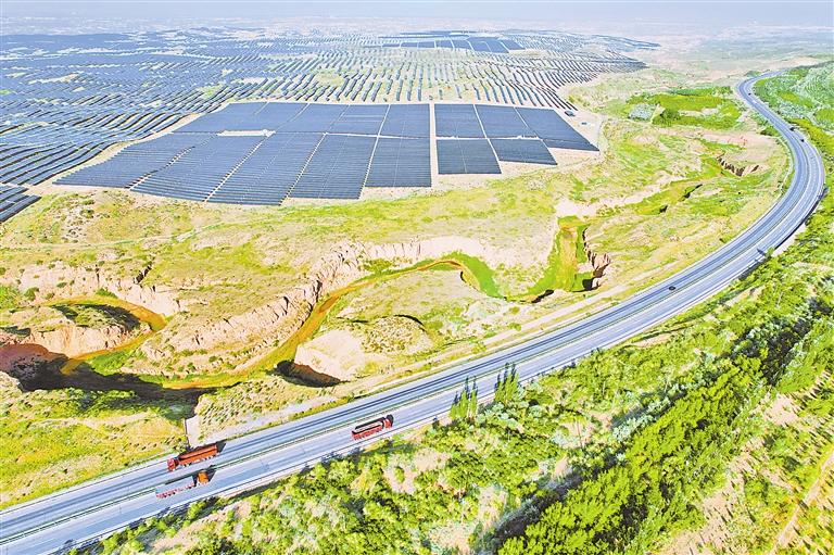 银川市黄河东岸,毛乌素沙地边缘的地域已成为生态绿洲,成片的光伏发电板与绿植交相辉映(资料图片)。记者 马楠 王洋 摄