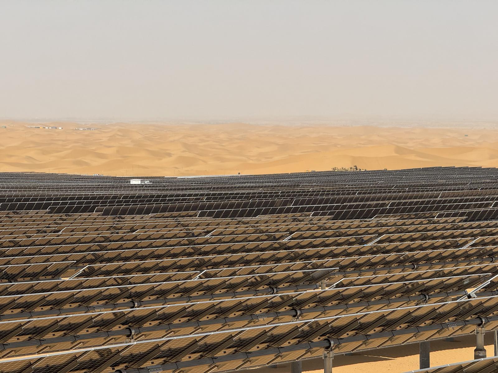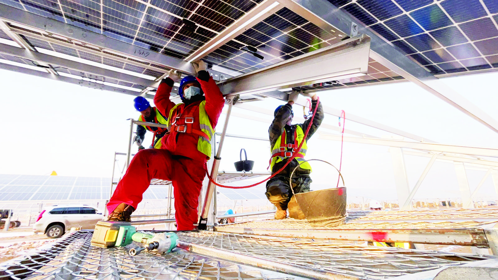 站在宁夏回族自治区中卫市的一座沙丘上,入冬的腾格里沙漠南缘,阳光炽烈。放眼眺望,不是浅黄色砂砾,而是一片深蓝。2.8万亩、220余万块光伏板首尾相连,随着沙丘起伏延伸,把沙漠染成靛蓝的海浪。