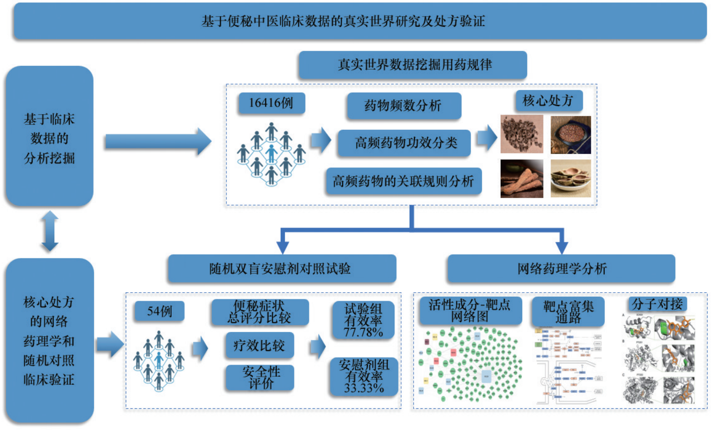 本研究整理上海中医药大学附属岳阳中西医结合医院4年治疗便秘的中医临床数据,利用数据挖掘的方法筛选出有别于传统治疗便秘的处方,并以此处方为干预方式进行了随机双盲安慰剂对照试验验证其临床疗效,运用网络药理学探索其作用机制,具体流程见图1。