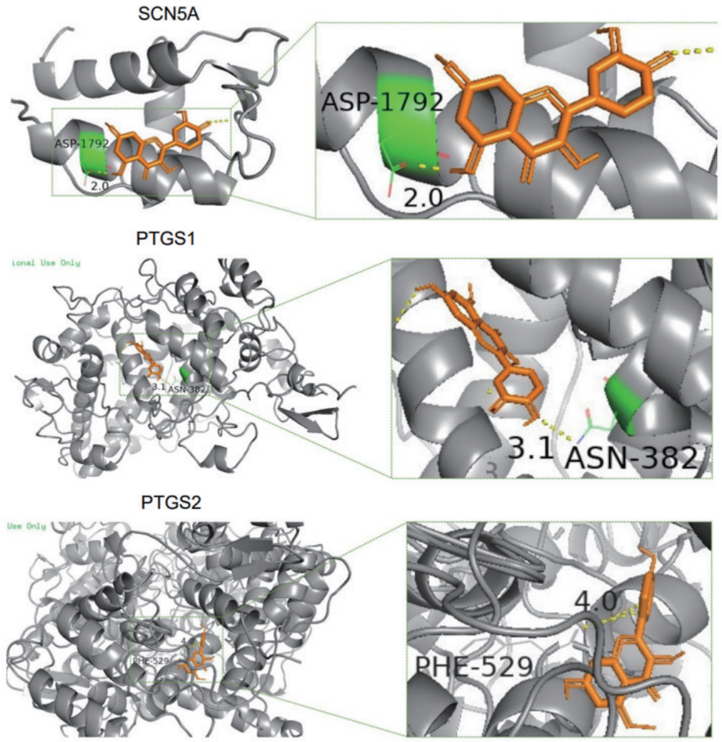 结果显示,11种活性化合物中有3种degree值较高,分别是槲皮素、β-谷甾醇和桉树醇。与活性成分关联度程度排名前3的靶点为前列腺素内过氧化物合酶2(PTGS2)、前列腺素内过氧化物合酶1(PTGS1)和钠通道蛋白5亚基α(SCN5A)。