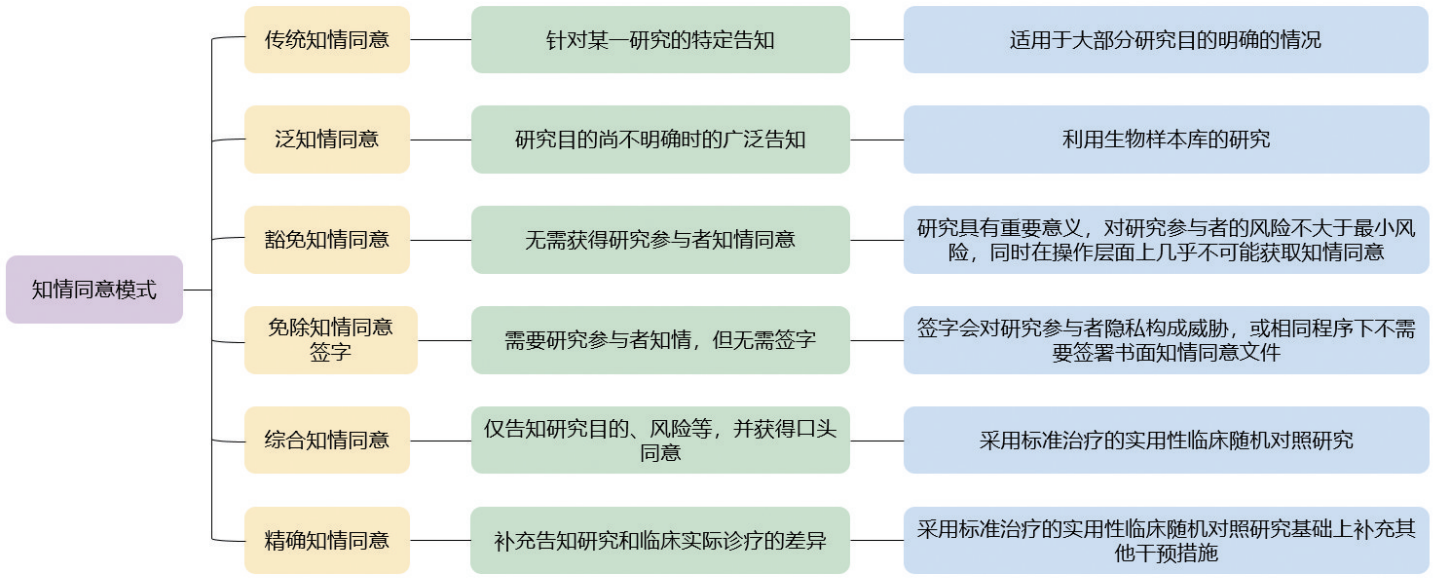 知情同意包含知情和同意2个过程,要求研究参与者必须在充分理解知情同意文本相关信息的基础上,不受欺骗、隐瞒或胁迫,经充足时间考虑后同意参加研究。根据风险和研究设计不同,多种替代性的知情同意模式被提出并用于RWS,如图1所示。