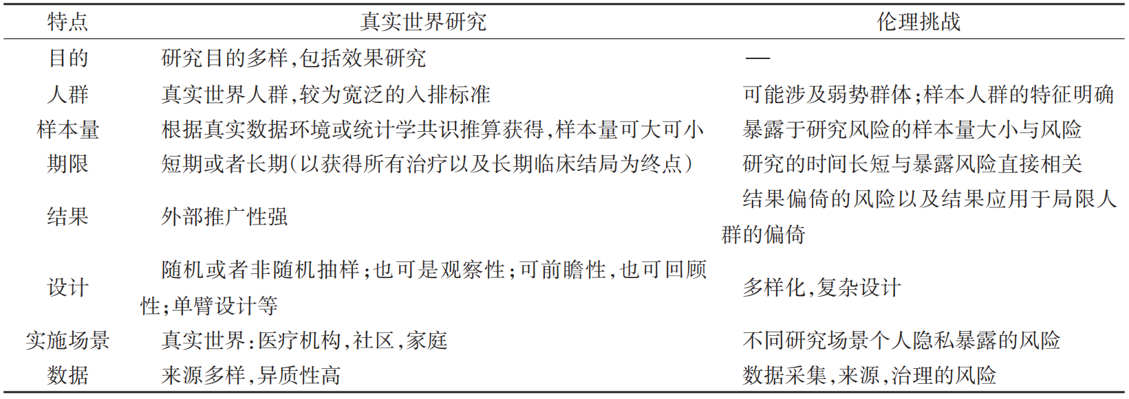 不论是RWS,还是传统随机对照的临床研究,共性的伦理问题通常包括以下几方面:1)研究方案目的、设计与实施;2)研究参与者风险与获益;3)知情同意内容及获取过程;4)研究参与者隐私及权益保障;5)研究利益冲突;6)研究注册和发表。RWS因其数据来源庞杂、研究类型多样,在涉及的伦理问题和风险上,增加了知情同意获取的难度、研究参与者隐私泄露或受到侵害的风险,以及数据治理和分析的复杂性。从RWS设计和随机对照临床试验的特点出发,需要考虑以下可能涉及的风险(表1)。