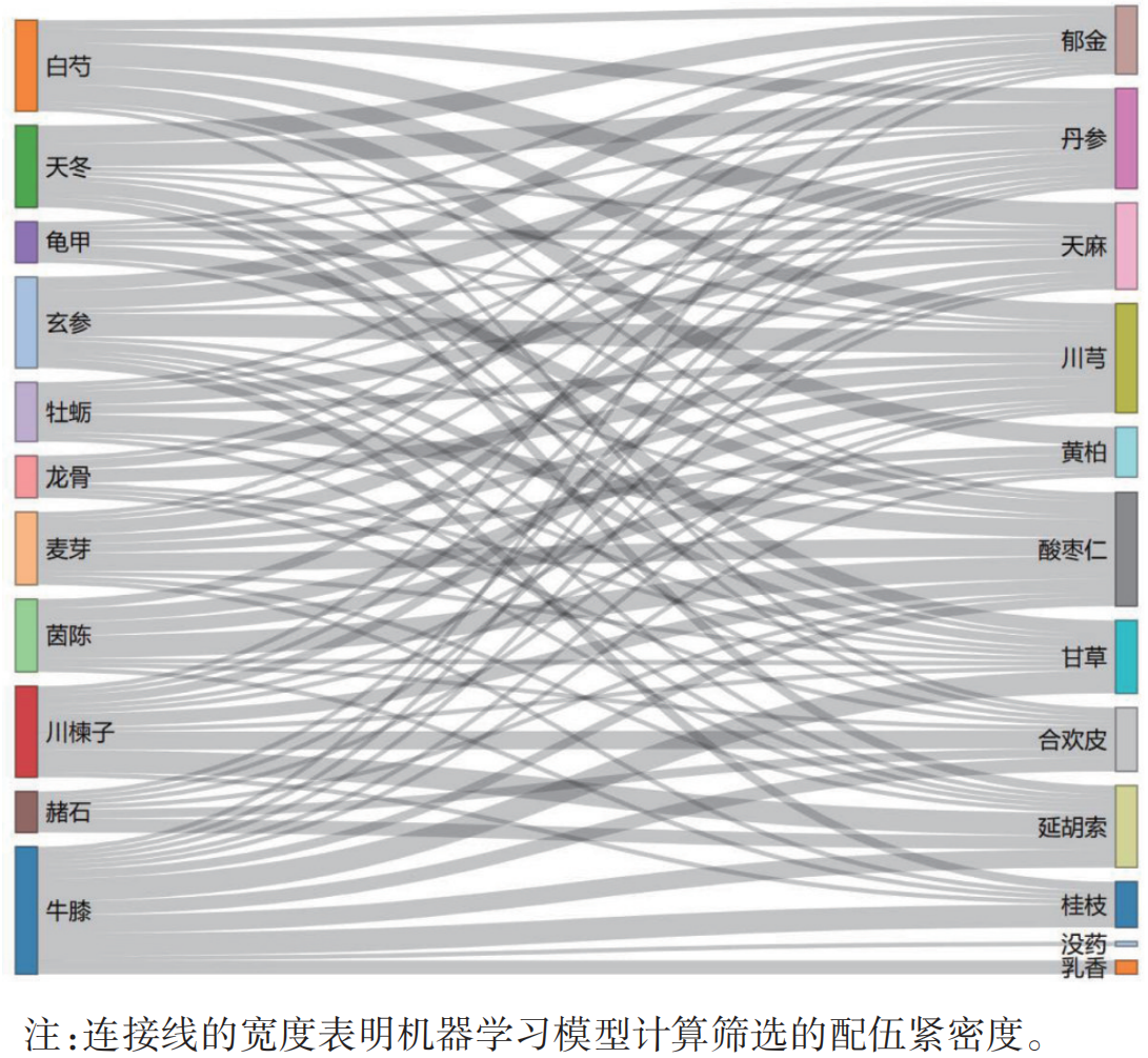 在有效配伍筛选方面,牛膝、酸枣仁、川芎、丹参为核心配伍药物(图4)。镇肝熄风汤的主要配伍方向包括滋阴通络、调补肝肾和清热安神。