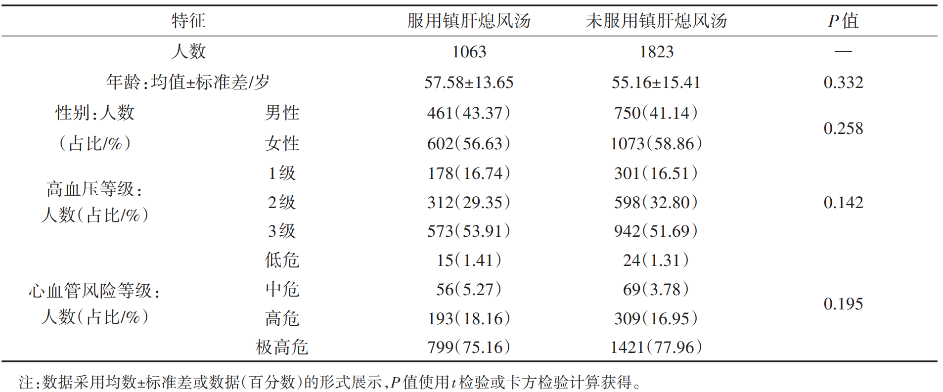 本研究共筛选1063名高血压患者服用镇肝熄风汤,另有1823名未服用镇肝熄风汤的患者作为对照,两组在年龄、性别、高血压等级、心血管风险等级等方面没有统计学差异。