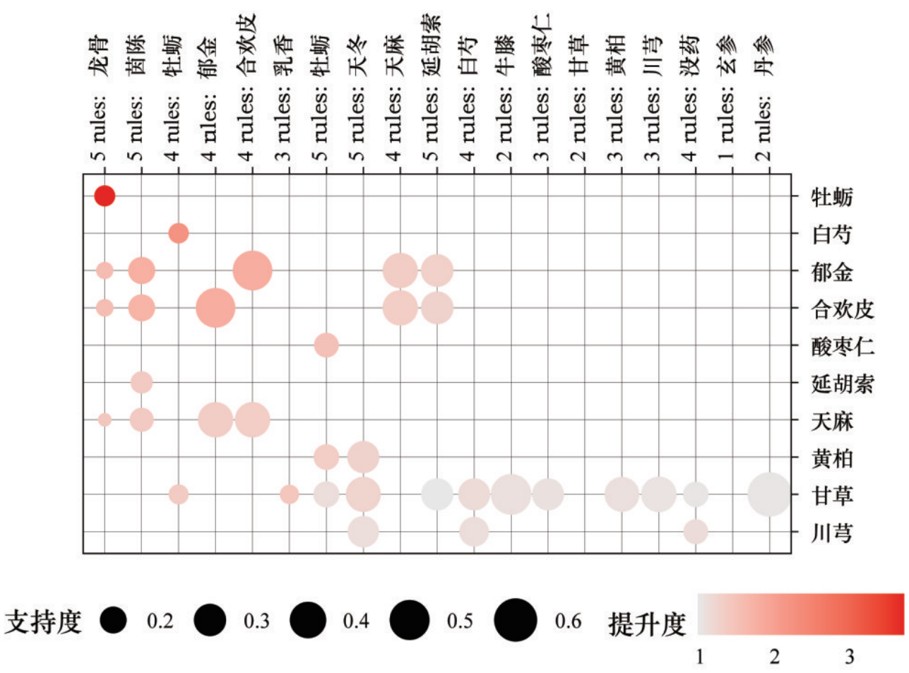 通过Apriori算法筛选镇肝熄风汤的常用配伍中药,包括桂枝、黄柏、合欢皮、郁金、天麻、延胡索、丹参、酸枣仁、川芎、青黛、乳香、没药(图2)。