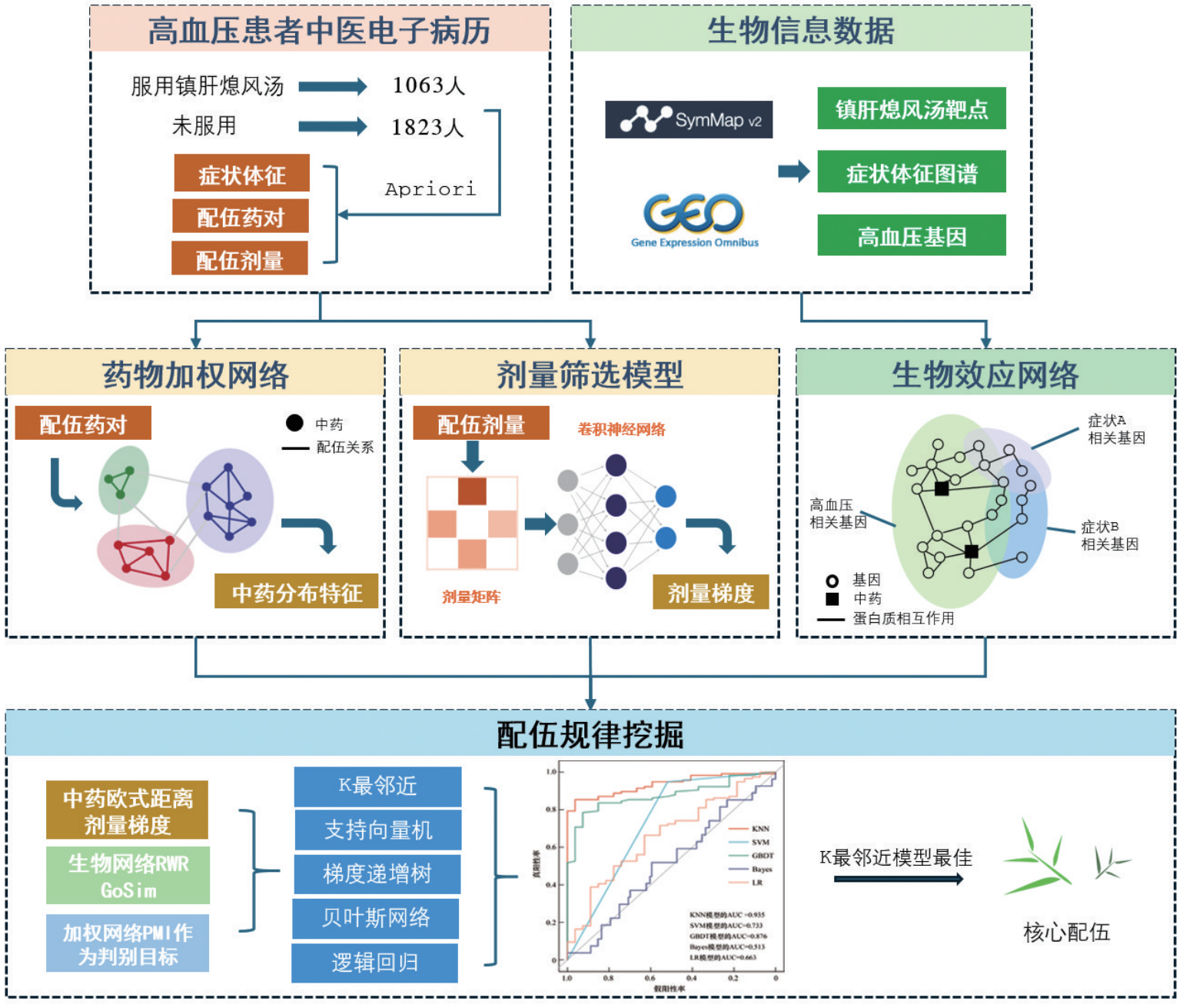 本研究利用机器学习算法进行建模,获得87个包含最佳剂量的镇肝熄风汤药对组合,验证了镇肝熄风汤配伍可以针对高血压发挥以控制炎症反映和调节能量代谢为核心多层次生物调控作用,表明KNN模型可有效融合CNN数据和网络拓扑数据,对传统的关联规则模型进行补充,且具有良好的普遍适用性,为多模态的中药数据集挖掘提供了一种跨学科研究方法,同时为临床决策提供多层次参考。