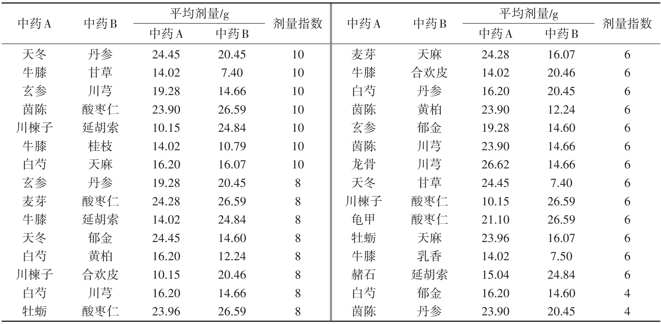 镇肝熄风汤作为经典方剂,已广泛应用于高血压的临床治疗,有丰富的长期临床数据,其组成包括牛膝、赭石、龙骨、牡蛎、龟甲、白芍、玄参、天冬、川楝子、麦芽、茵陈和甘草。根据多项临床研究和系统评价报道,在化学药物治疗的基础上联合镇肝熄风汤有助于加强降压效果,改善患者不适症状,提高患者依从性,实现降低心脏、脑、肾脏及血管并发症和死亡的总风险。中医学是以“天人合一”为导向的医学模式,要求中药处方能够兼顾患者的不适症状,并强调“君、臣、佐、使”的剂量变化,具有繁杂的配伍规则。以真实数据为基础充分进行数据挖掘,可贴合中医诊疗中的随证加减规律,充分体现诊疗中个体化和药物应用特征。