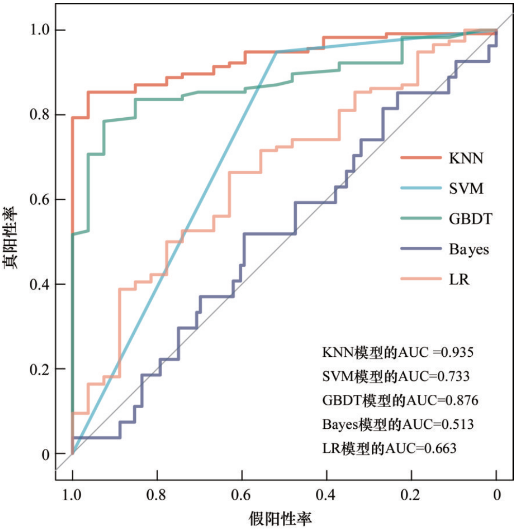 图3 KNN、SVM、GBDT、Bayes和LR模型的ROC曲线