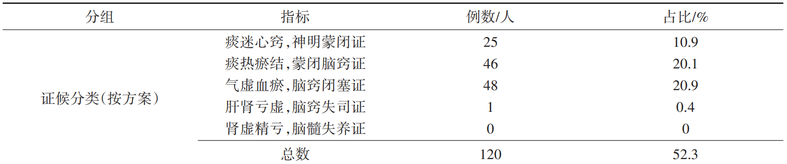 中医证候信息中,证候要素分为痰湿等6种类型,占比前3位的证候要素为痰湿、痰热、血瘀,其余证候要素及占比见表4。辨证分型按照中医诊疗方案分为痰迷心窍,神明蒙闭证等5种类型;此外,还根据临床实际辨证情况总结为风痰阻络等6个证型,各证候及证型人数及比例见表5。