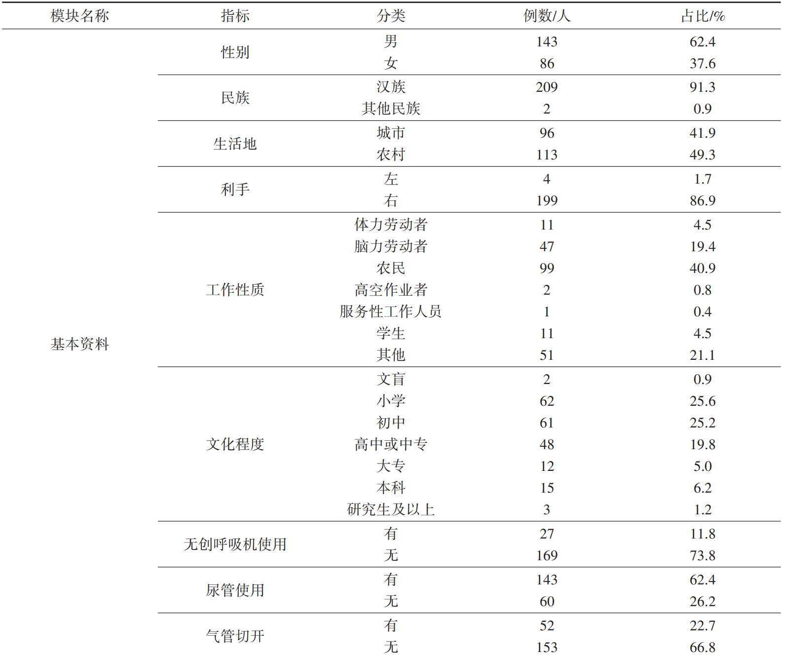 本研究共纳入229例符合纳入标准的PVS患者。人群平均年龄(51.54±16.54)岁,最大年龄95岁,最小年龄5岁,男性143人(62.4%),女性86人(37.6%)。主要发病原因有头部外伤、脑血管疾病等。其余指标例数及占比见表2。