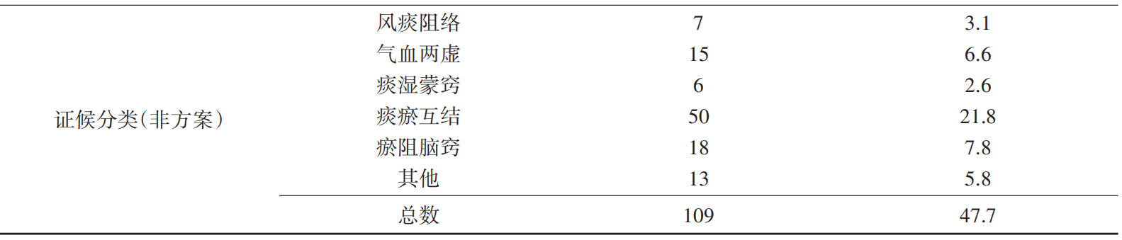 所有治疗指标中,229名患者服用中成药治疗的共有21例,不足10%。接受针灸治疗的患者共193例(84.3%),针刺主穴及配穴有多种选择。穴位注射、中药汤剂、中药制剂、穴位贴敷、推拿治疗、注射剂、特殊疗法等治疗方式均有相应患者接受。