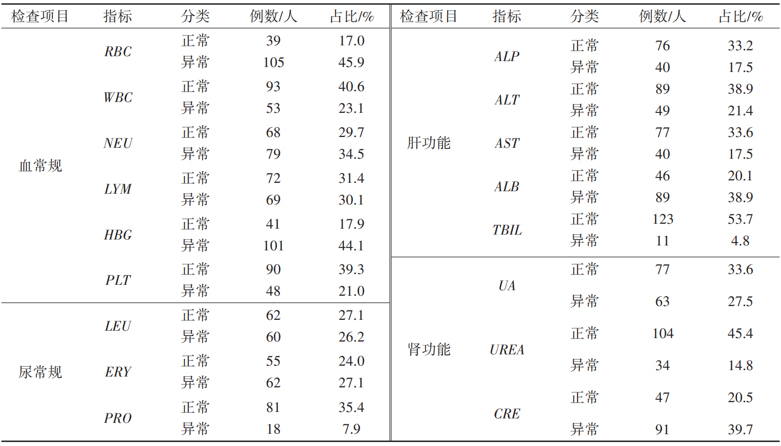 对患者入院首次实验室检查结果整理,将多项指标异常情况进行定义,各指标具体人数及情况见表3。