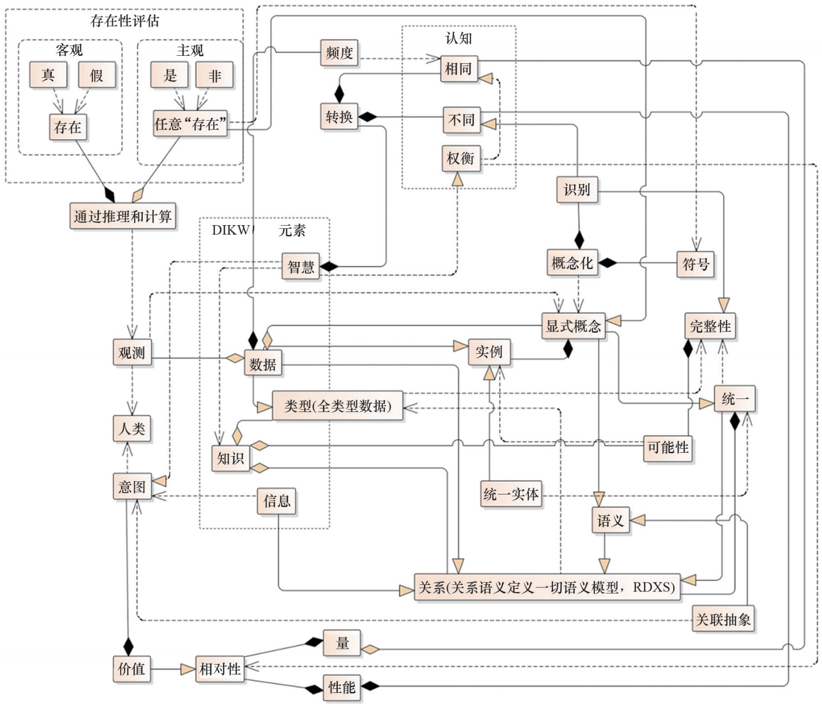 为了突破对语义完整性、一致性、精确性、正确性、客观性及相互独立假设的确定性依赖,符合更普遍的工程实践中只拥有部分数据、信息、知识以及有限智慧与意图的智能化交互场景,Duan等面向本质语义与存在语义,提出关系定义一切语义模型(Relationship Defined Everything of Semantics,RDXS)(图1),借助DIKW概念体系将知识图谱扩展为相互关联的DIKWP图谱体系:数据图谱、信息图谱、知识图谱、智慧图谱以及意图图谱(图2),来映射不完整、不一致、不精确的主客观DIKWP资源。