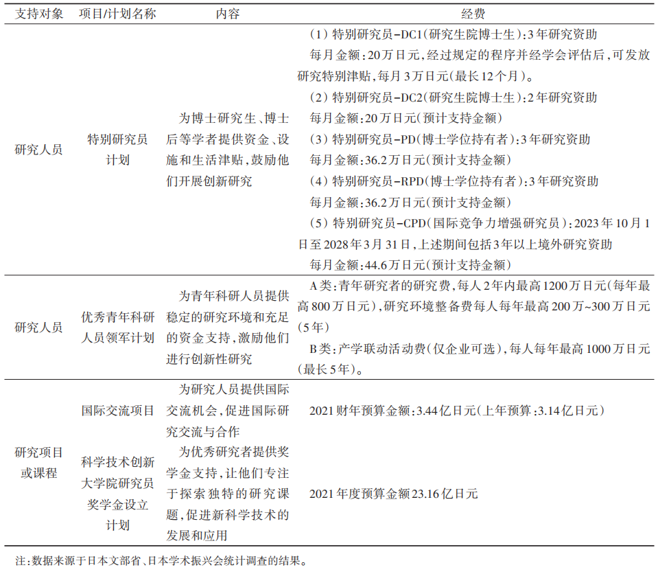日本政府为了给青年学者创造一个安稳的环境并增加获得研究基金的机会,设立了各类由政府资助的科学研究经费支持计划(表2)。