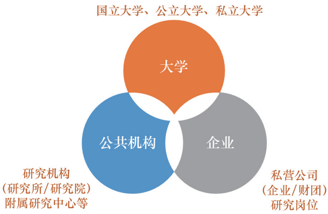 日本科研机构分类与中国相似,大学科研人员主要关注基础研究。公共机构研究人员一般隶属于国家或地方政府,在注重基础研究的同时,主要侧重于应用研究和技术创新。企业研究部门则专注研究开发产品和服务,为企业带来利益,主要关注应用研究和开发竞争性强的产品和服务(图1)。