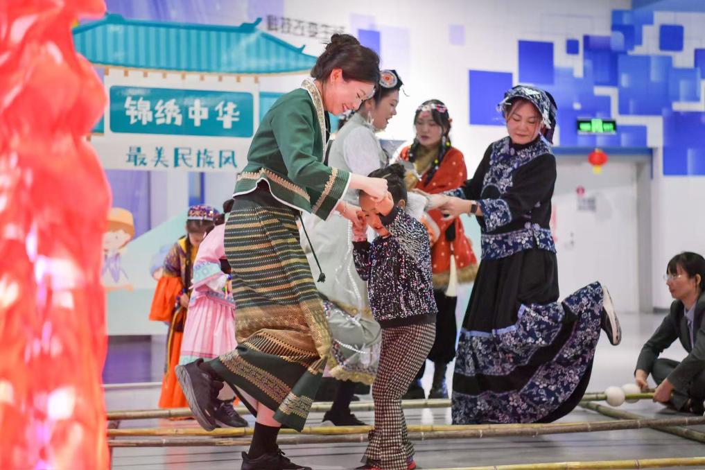 科技辅导员们身着少数民族服饰,带领观众跳竹竿舞。(宁夏科技馆供图)
