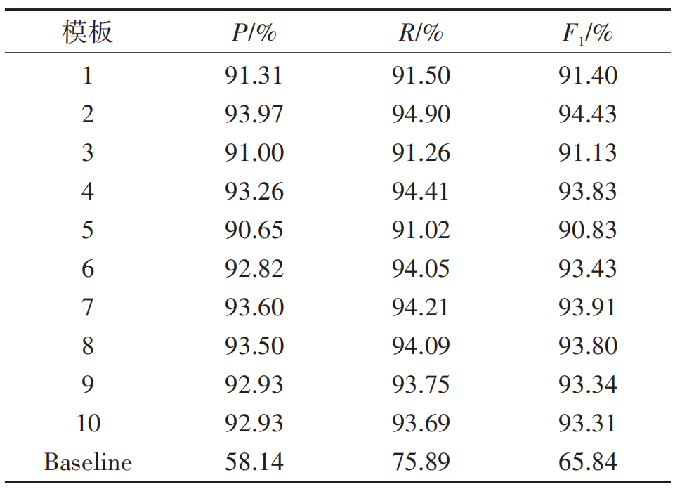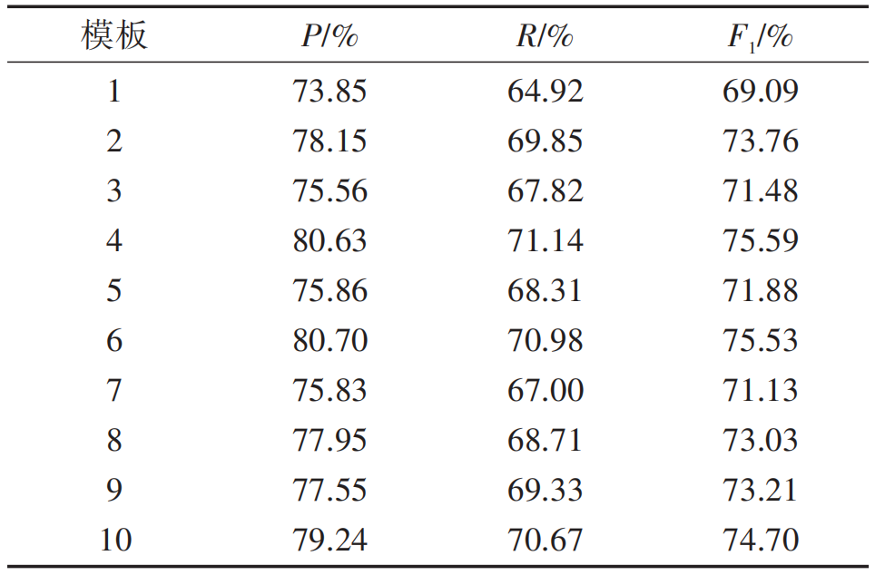 通过CRF模型将字面信息作为主要特征,分别利用上述10个特征模板进行实验,以筛选断句效果最好的特征模板,实验结果如表3所示。