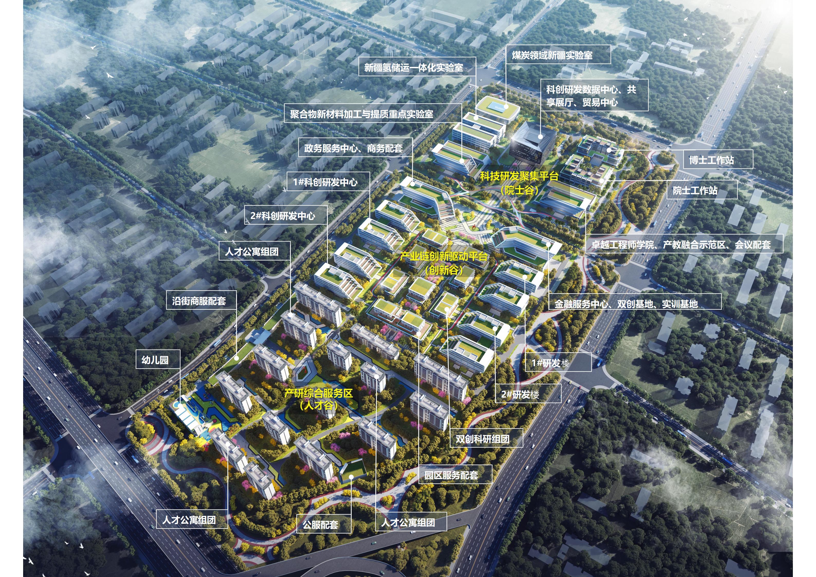 园区采用“三谷八组团”功能布局,院士谷集成共享实验室、院士/博士工作站、科技创新展示中心等高端研发平台;创新谷配备金融及信息交流平台,涵盖高标准化工创新研究院、新材料检测中心等核心设施;人才谷建设科学家社区,包括科学家驿站(商业配套)、智创学园(教育配套)等。