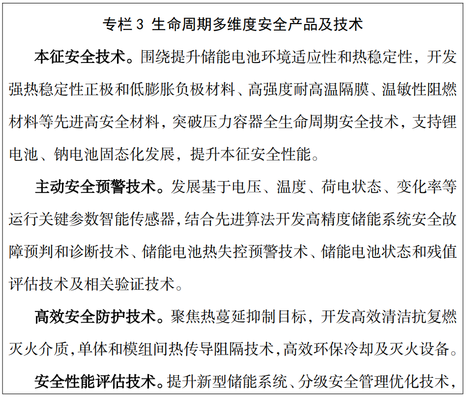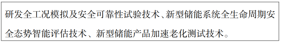 围绕新型储能系统生产制造、运行维护、回收利用全生命周期,构建本征安全、主动预警、高效防护、安全应用等多维度技术体系。加强新型储能各技术路线热失控及燃烧爆炸失效机理研究,突破储能电池本征安全与控制技术,支持基于数字孪生和人工智能技术开展新型储能安全预警技术攻关。开展多元新型储能技术热蔓延机理研究,推动新型储能单元、系统、电站多尺度消防技术创新,实现电池模块级精准消防。加快新型储能产品健康状态在线评估等技术推广应用,探索建立新型储能产品安全分级评价技术体系。