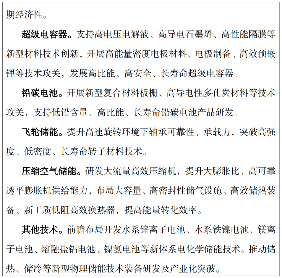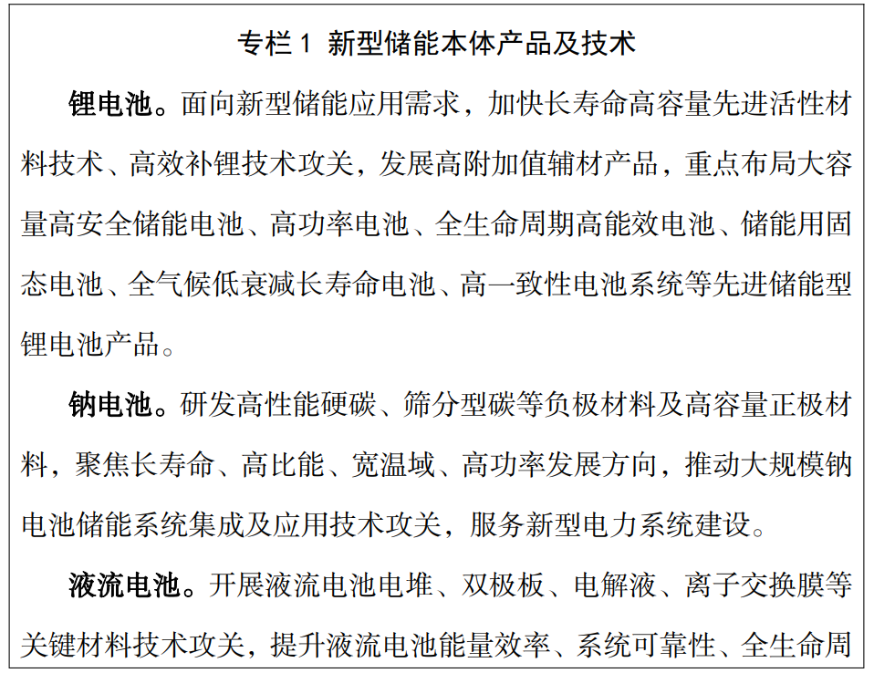 面向中短时、长时电能存储等多时间尺度、多应用场景需求,加快新型储能本体技术多元化发展,提升新型储能产品及技术安全可靠性、经济可行性和能量转化效率。加快锂电池等成熟技术迭代升级,支持颠覆性技术创新,提升高端产品供给能力。推动超级电容器、铅碳电池、钠电池、液流电池等工程化和应用技术攻关。发展压缩空气等长时储能技术,加快提升技术经济性和系统能量转换效率。适度超前布局氢储能等超长时储能技术,鼓励结合应用需求开发多类型混合储能技术,支持新体系电池、智能电池、储热储冷及新型物理储能等前瞻技术基础研究。