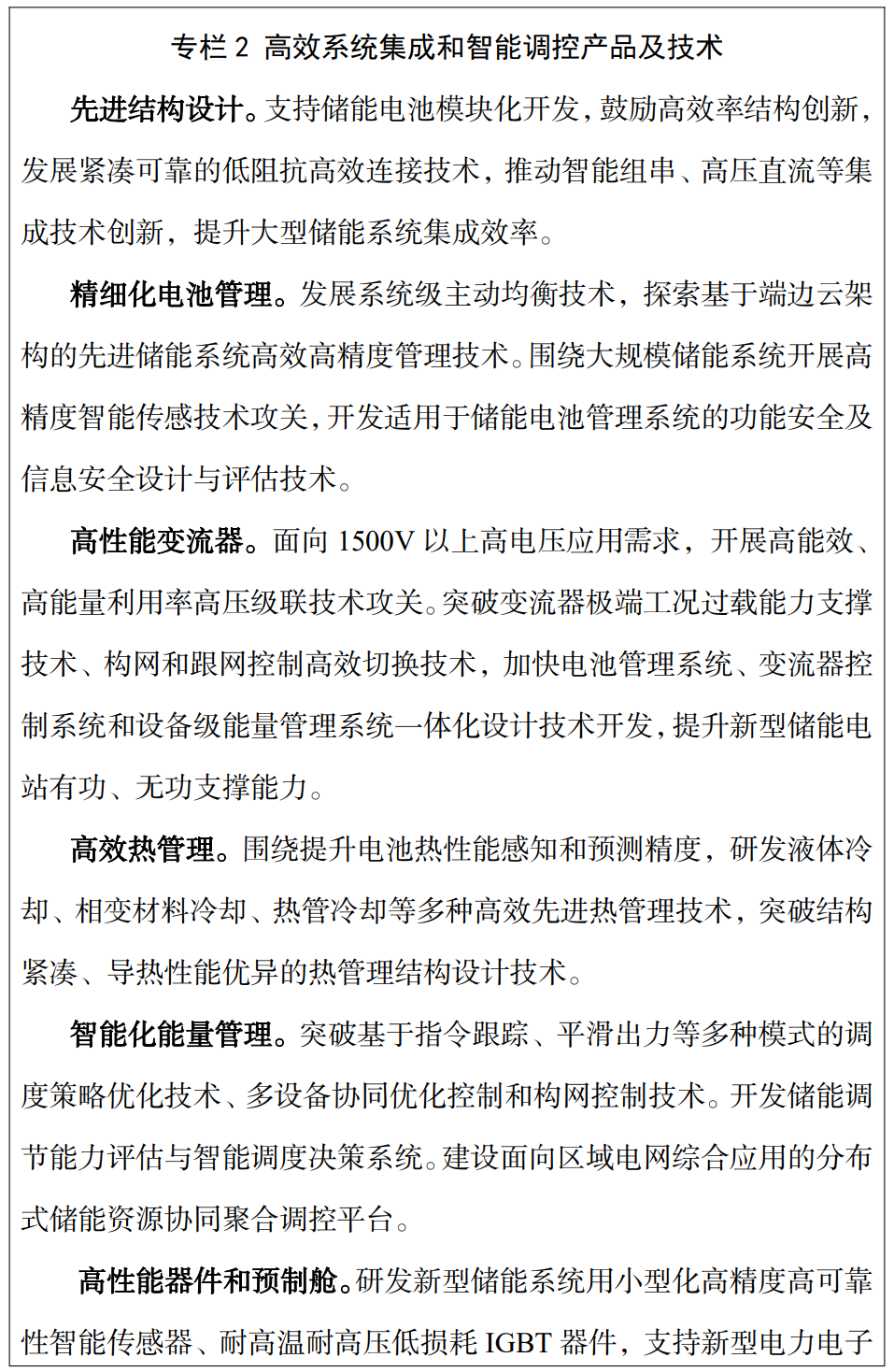 推动新型储能与新一代信息技术深度融合,通过对系统能量流和信息流的经济配置、功能优化运行、逻辑有效衔接,实现储能系统高效集成和精准调控,提升新型储能产品智能化水平。聚焦系统结构设计、精细化电池管理、高效热管理和能量管理、辅助设备集成、高性能预制舱等技术开展集中攻关,提高先进功率半导体、智能传感器、电源管理芯片、大功率高效变流器等关键核心器件与部件供给能力。面向大规模新能源消纳和源网荷储一体化需求,推动新型储能集群协同控制、分布式储能聚合控制等技术创新。