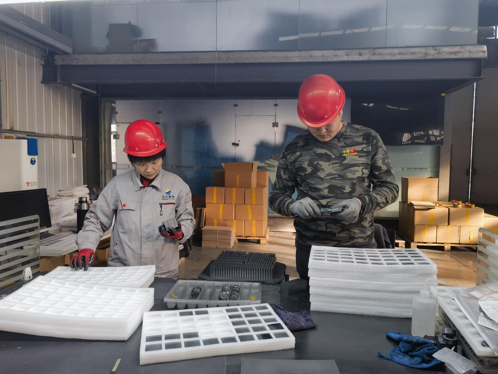 工人正在包装防弹陶瓷片。