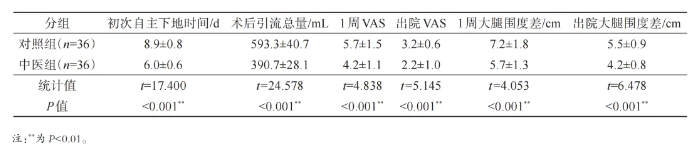 组间比较显示,对照组在术后至出院日期间(围手术期)的初次下地时间、术后引流总量、术后1周及出院日患肢的VAS评分、术后1周及出院日患肢与健侧的大腿围度差值均显著高于中医组(表2)。