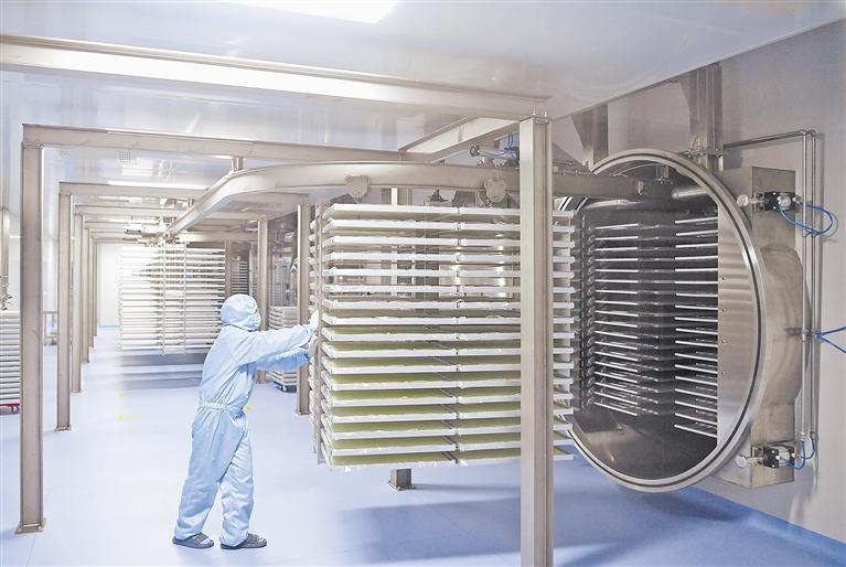 优乳(宁夏)生物工程有限责任公司工作人员从冻干机中推出盛放着冻干成品的物料车。