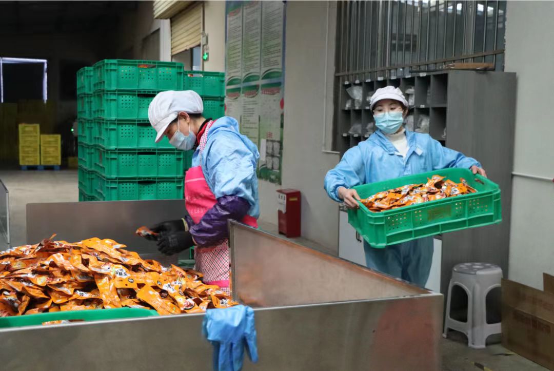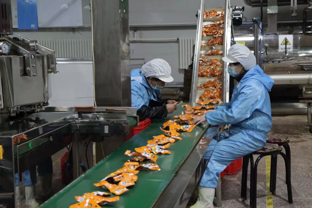 走进宁夏好水川食品有限公司生产车间内,到处都是红红火火的生产场景。各类机械轰隆作响,工人们正在紧张有序地进行卤煮制作、分拣包装、杀菌消毒等工序。一袋袋产品整齐码放,等待着发往全国各地。