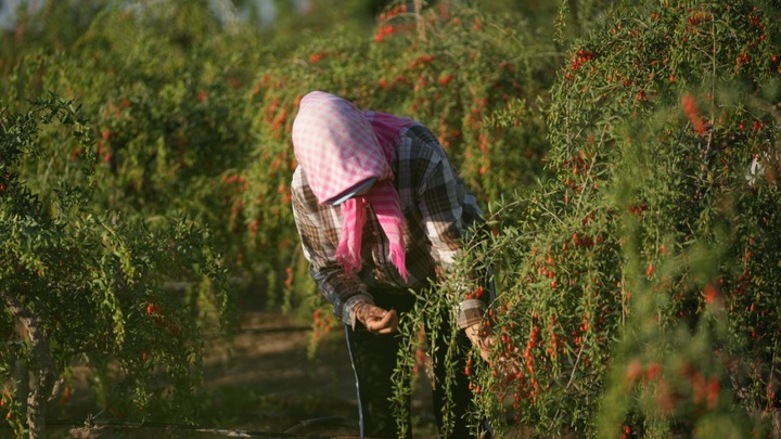 在百瑞源枸杞种植基地,农民在采摘枸杞。(受访者供图)