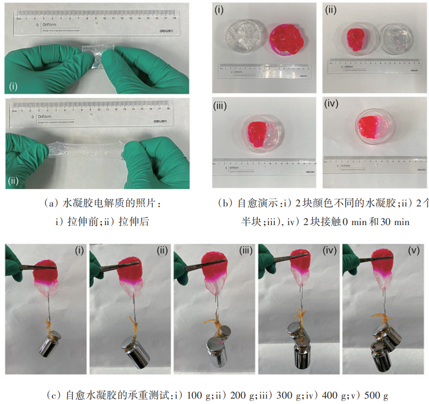 随着研究的深入,原位电解质策略被提出,以解决传统非原位水凝胶电解质在界面上的问题。为进一步提升水凝胶电解质的力学性能,研究者开发了多重网络水凝胶电解质,这些电解质通过化学交联和物理交联的结合,达到高强度、高柔韧性与高离子传导性的统一。此外,自愈合水凝胶电解质的开发为电解质的稳定性、寿命及安全性提供了新的解决方案(图3(b)~(c))。