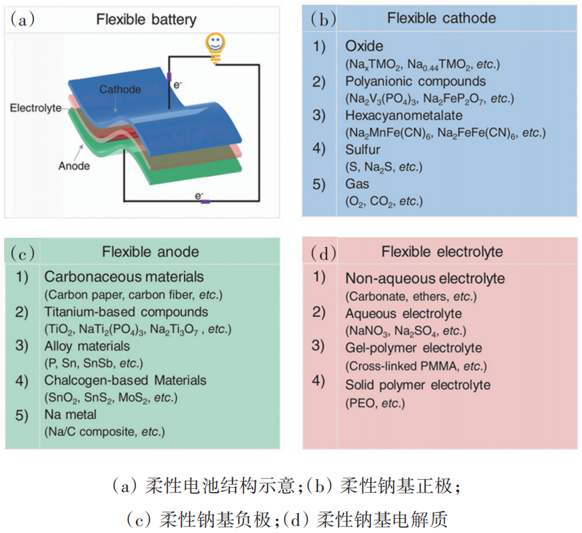 柔性钠离子电池如图2所示。相比传统锂离子电池,钠离子电池以钠为储能离子,原料丰富、成本低廉,且具有较高的环境友好性和安全性。柔性钠离子电池在材料和结构设计上通常采用柔性电极材料(如碳基材料、导电聚合物)与柔性固态或半固态电解质(如凝胶电解质和离子导电高分子)。通过优化电极与电解质的界面相容性及柔性支撑结构,柔性钠离子电池可以在弯曲、拉伸等变形条件下保持稳定的电化学性能。这类电池在可穿戴设备、智能纺织品和柔性传感器等领域具有广阔的应用前景,同时推动了柔性能源储存技术的发展。