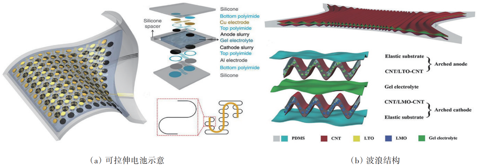 波浪结构是一种通过在电池电极材料中引入周期性弯曲几何形态,提高柔性和拉伸耐受性的设计策略。其基本特点是电极材料表面呈波浪状或弯曲形态,有助于缓解变形过程中产生的应力,分散外力并通过结构变形吸收和释放应力,从而显著提升材料在弯曲和拉伸下的稳定性(图5)。波浪结构在柔性电池中的应用主要体现在2个方面:一是提高电池电极材料的可拉伸性和耐久性,二是通过优化波浪形状的参数改善电池电化学性能并延长使用寿命。