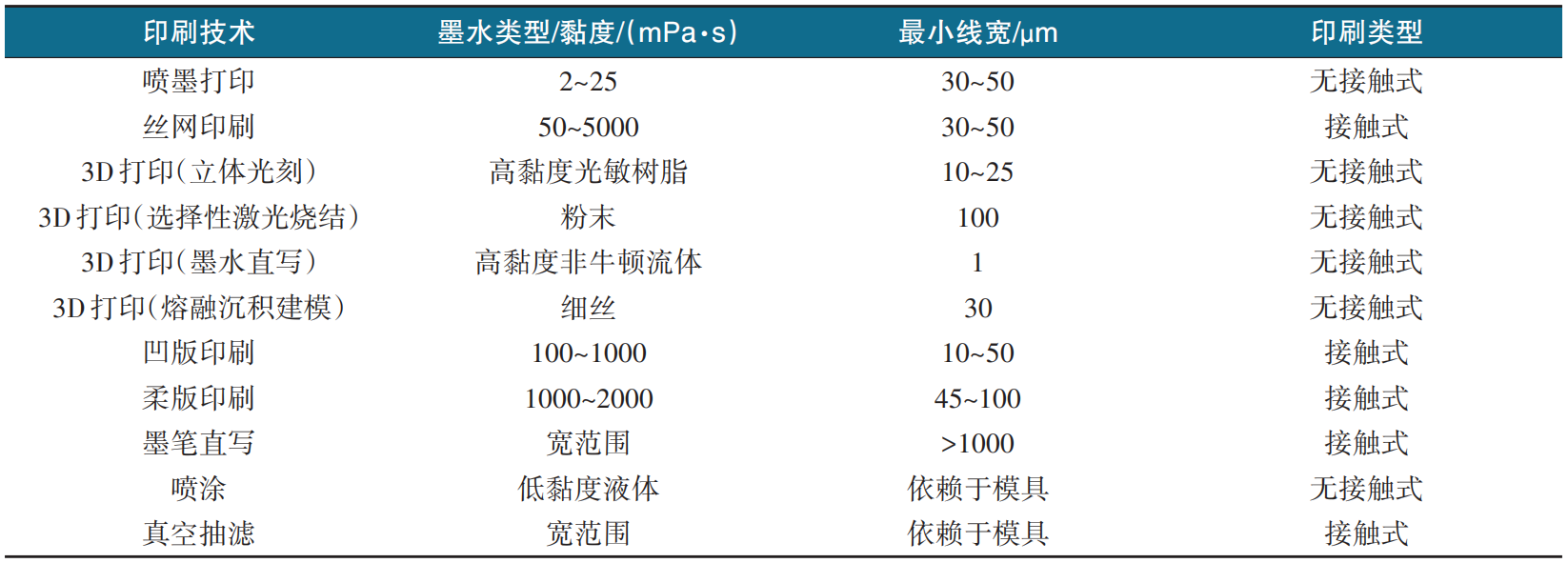 在柔性储能设备的制造中,电极图案化技术至关重要,这通常通过沉积、印刷等方法将电极活性材料制备成纳米到微米厚度的固态薄膜。柔性电子器件的设计需要考虑基底材料的热稳定性、兼容性、一致性和大变形性等特性。目前,常见的印刷技术如表1所示。
