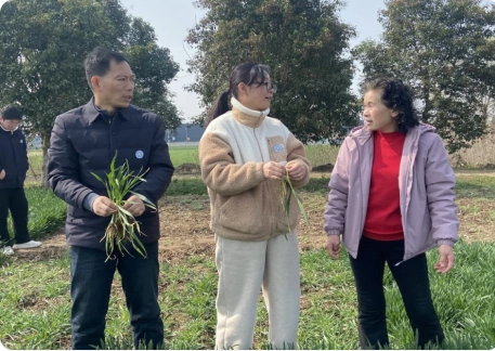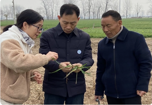 服务团通过多点调研、实地查看,发现当前的小麦苗情总体表现为:小麦已开始返青起身,越冬期间弱小麦田群体开始快速发育,早播麦田的冻害问题已基本消失,苗黄苗弱问题已开始转变,根系发育好,苗色深绿,植株健壮,两极分化明显,整体长势良好,丰产架子基础已初步显现,呈现出一副欣欣向荣的态势。在指导中,服务团也发现一些问题需要及时管理或预防,调查发现,受年前及近期两次降水影响,随着温度升高,部分田块有纹枯病、茎基腐病发生的迹象;受年前高温暖冬的影响,部分田块叶片发黄、黄化严重;受2月初持续低温的影响,年前播量偏大、播期偏早的麦田,受冻害影响较大,返青速度较慢,且两极分化不明显;近期温度升高,看麦娘、牛繁缕等田间杂草快速生长,婆婆纳、荠荠菜等杂草开始开花繁殖。