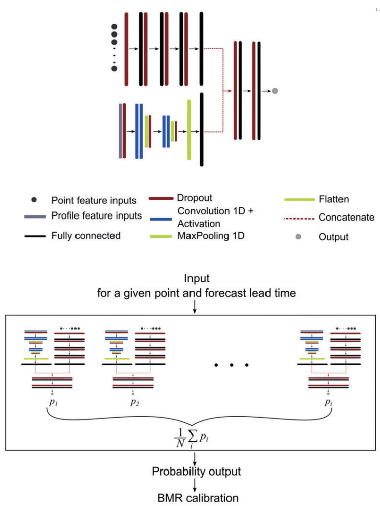 除了全面的天气系统预测外,ML方法还可用于闪电等特殊天气现象的预测。来自意大利的Mazzino团队提出了一种集成AI和NWP模型的方法FlashNet,使用人工智能增强NWP对闪电的预测(图10)。结果表明,人工智能增强算法的预测能力明显高于ECMWF模型中采用的完全确定性算法。