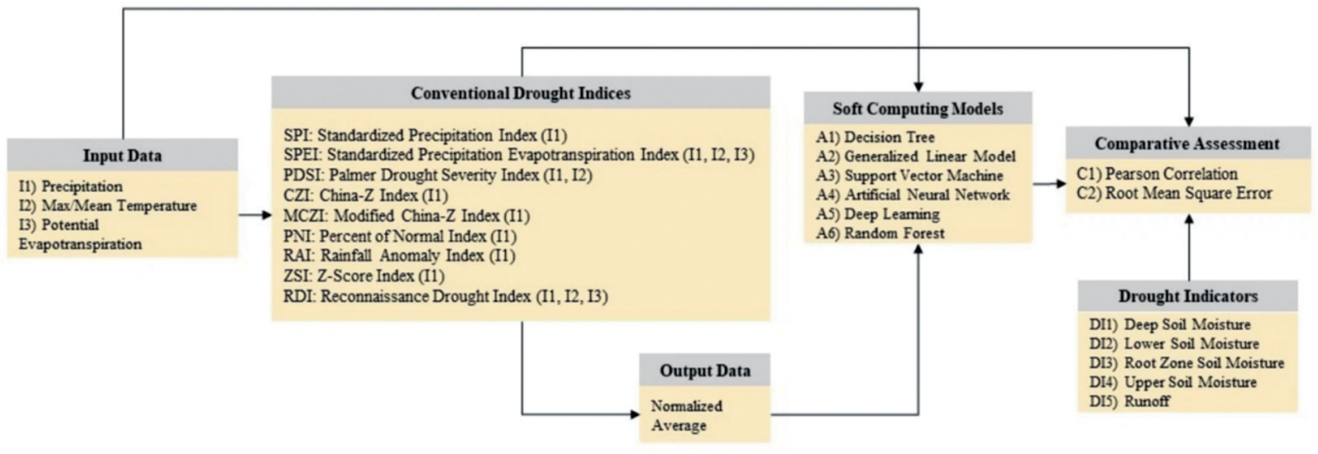 干旱同样被认为是一种重大的自然灾害,可导致严重的经济和社会影响。由于干旱现象的内在复杂性和水文气候条件的差异,没有通用的干旱指数可用于有效监测世界各地的干旱。来自University of Sharjah的Abdallah团队开发了一种新的基于AI的干旱指数,与各种人工智能模型配合使用以描述和预测干旱(图15)。