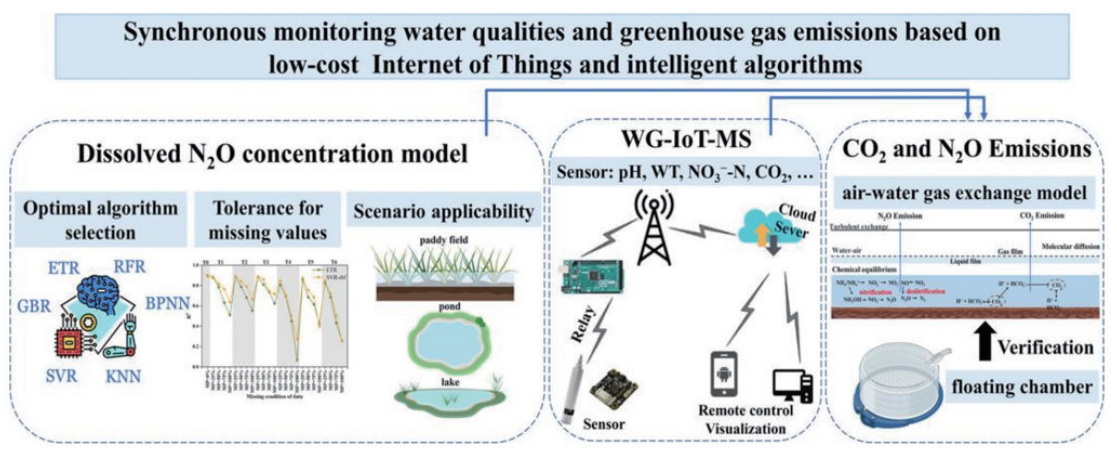 除管理单一环境介质如水、空气质量外,人工智能技术还能够实现两种以上环境介质的同步监测。南京农业大学的高翔团队开发了一种基于物联网(IoT)的新型监测系统(WG-IoT-MS),同步监测稻谷种植区的水质和温室气体排放(图6)。