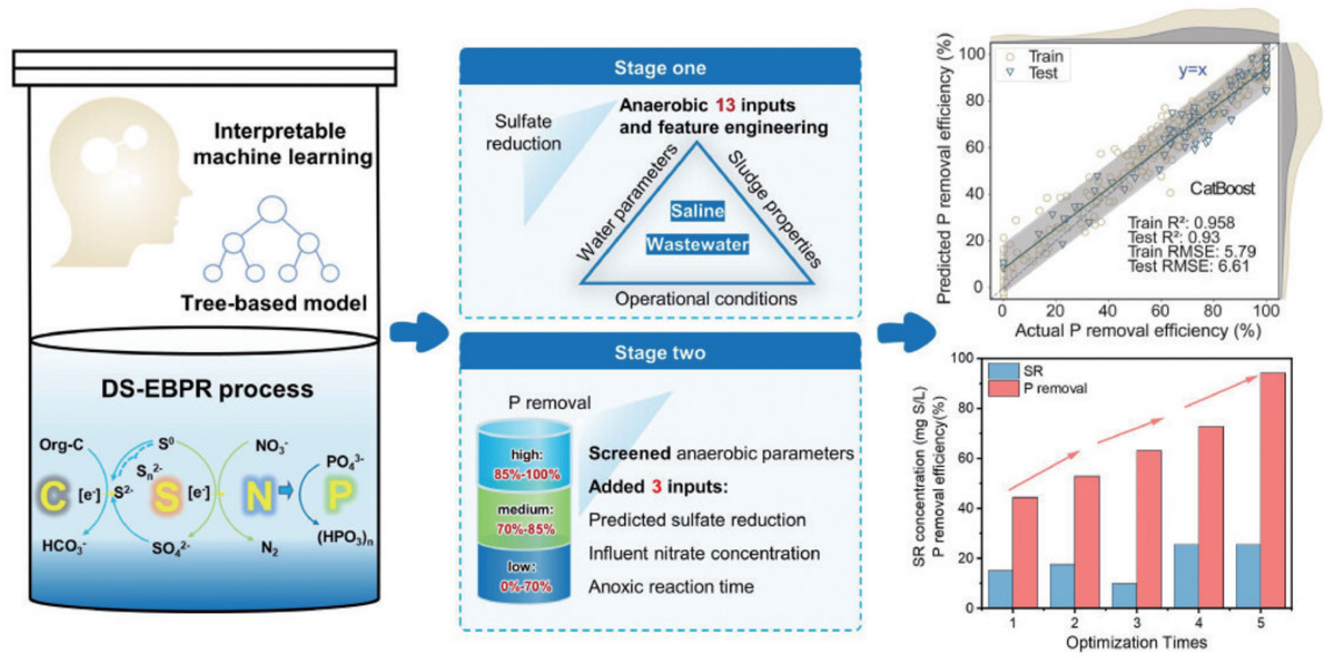 人工智能技术可以用于污水处理过程的管理,优化污水处理技术,简化技术选择过程。华中科技大学郭刚团队引入一种可解释的XGBoost-CatBoost机器学习方法来预测反硝化硫(S)转化相关的强化生物除磷(DS-EBPR)工艺处理含盐废水中S转换驱动的磷去除效率,并优化DS-EBPR流程(图2)。