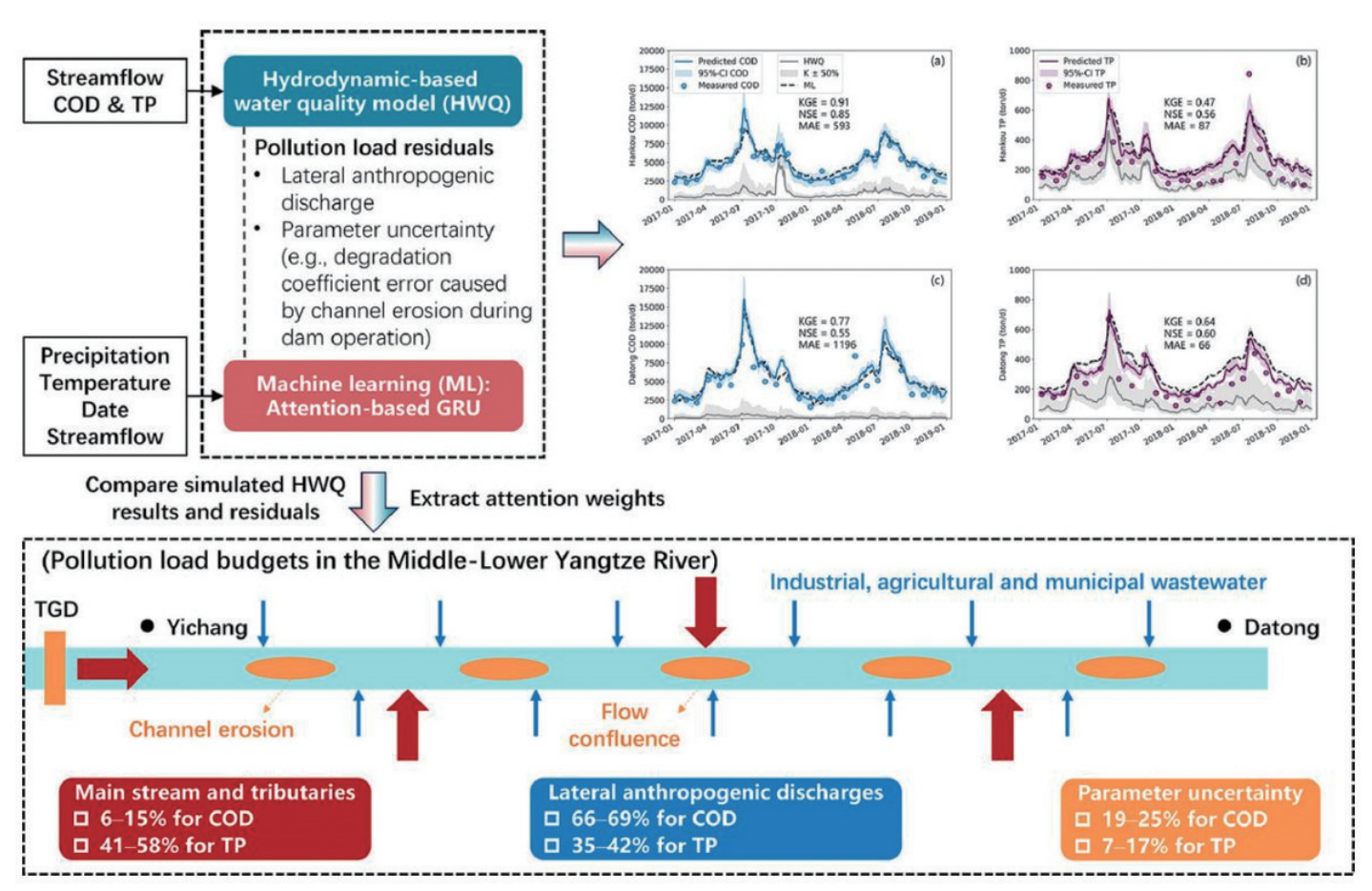 在地表水管理中,准确预测河流水质对可持续水资源管理至关重要,人工智能技术通过与新型方法或传统水质模型耦合,取得了更好的预测效果。厦门大学的黄金良团队创新性地将小波分析(WA)和迁移学习(TL)方法与长短期记忆网络(LSTM)相结合,同时解决了河流水质预测中的非平稳性和数据限制性问题。武汉大学的夏军团队将传统水质(HWQ)模型与机器学习(ML)方法相结合,以分析2014—2018年长江中下游的每日污染负荷(即化学需氧量COD和总磷TP)及其来源(图3)。