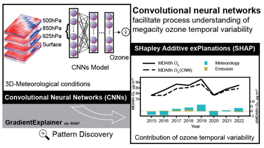 人工智能技术能够用于空气中具体污染物动态变化的监测和预测。南方科技大学的沈惠中团队采用卷积神经网络(CNN)来研究气象场的三维空间变化对深圳大气中臭氧的日动态、季节性和年际动态的影响(图4)。